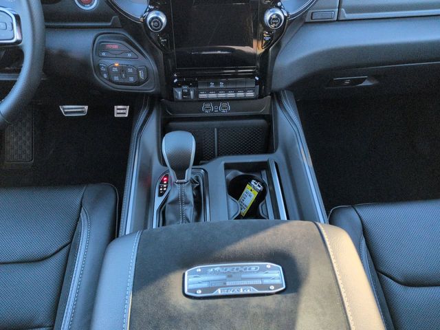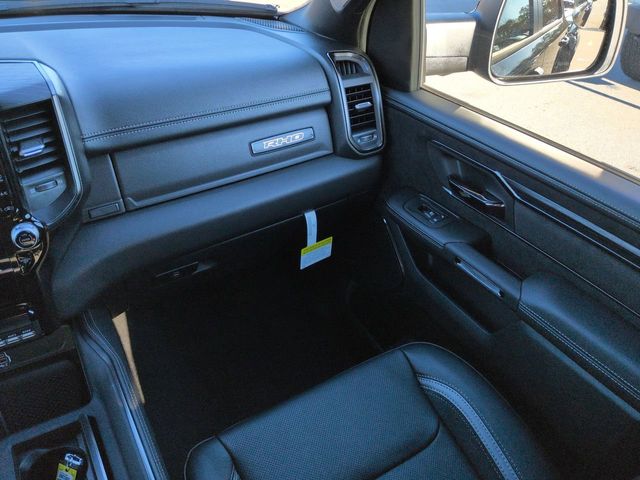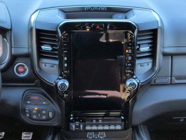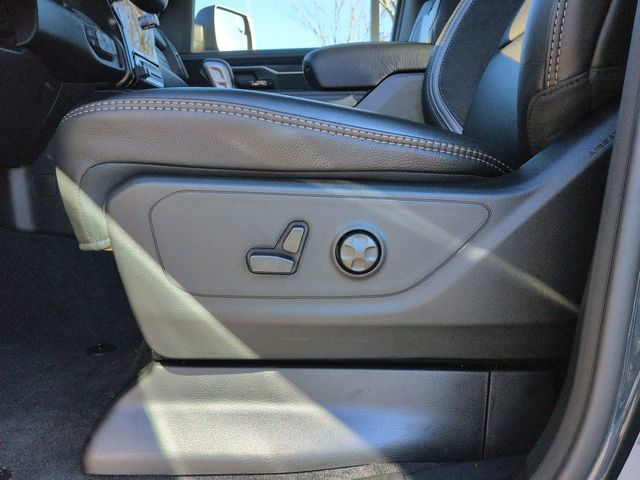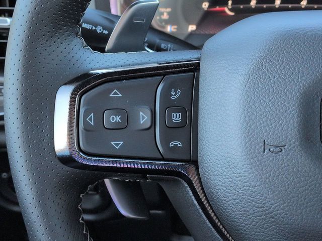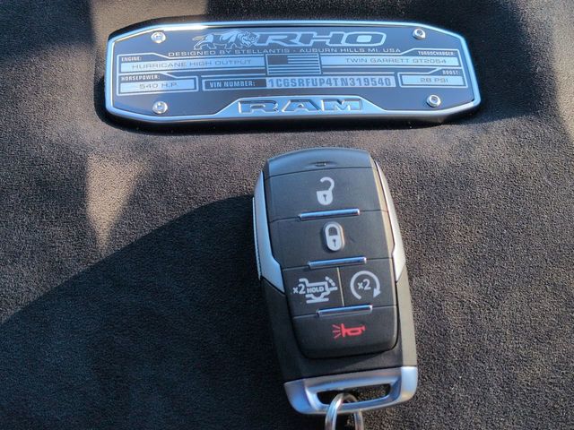 Quick Order Package 22Y RHO, 10 Speakers, 3.92 Rear Axle Ratio, 4-Wheel Disc Brakes, 4G LTE Wi-Fi Hot Spot, ABS brakes, Adaptive suspension, Adjustable pedals, Air Conditioning, Alloy wheels, AM/FM radio, Apple CarPlay/Android Auto, Auto High-beam Headlights, Auto Power-Folding Mirrors, Auto-dimming door mirrors, Auto-Dimming Exterior Driver Mirror, Auto-dimming Rear-View mirror, Automatic temperature control, Brake assist, Compass, Connected Travel and Traffic Services, Connectivity - US/Canada, Delay-off headlights, Disassociated Touchscreen Display, Driver door bin, Driver vanity mirror, Dual front impact airbags, Dual front side impact airbags, Electronic Stability Control, Exterior Mirrors Courtesy Lamps, Exterior Mirrors with Heating Element, Exterior Mirrors with Supplemental Signals, Exterior Parking Camera Rear, Flareside Box, Front anti-roll bar, Front Bucket Seats, Front Center Armrest w/Storage, Front dual zone A/C, Front fog lights, Front License Plate Bracket, Front reading lights, Front wheel independent suspension, Fully automatic headlights, Garage door transmitter, GPS Navigation, HD Radio, Heated door mirrors, Heated front seats, Heated steering wheel, Illuminated entry, Integrated Center Stack Radio, Integrated Voice Command with Bluetooth, Leather Shift Knob, Leather steering wheel, Leather Trimmed Bucket Seats, Low tire pressure warning, Navigation System, Occupant sensing airbag, Outside temperature display, Overhead airbag, Overhead console, Panic alarm, Passenger door bin, Passenger vanity mirror, Power door mirrors, Power driver seat, Power passenger seat, Power steering, Power windows, Radio data system, Radio: Uconnect 5 Navigation with 12.0" Display, Rear reading lights, Rear seat center armrest, Rear step bumper, Rear window defroster, Remote keyless entry, Security system, SiriusXM Radio Service, Speed control, Split folding rear seat, Sport steering wheel, Steering wheel mounted audio controls, Tachometer, Telescoping steering wheel, Tilt steering wheel, Traction control, Trip computer, Turn signal indicator mirrors, USB Host Flip, Variably intermittent wipers, Voltmeter, and Wheels: 18" x 9" Black Paint/Polish Aluminum.