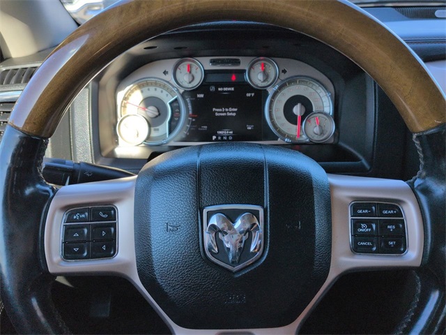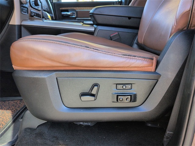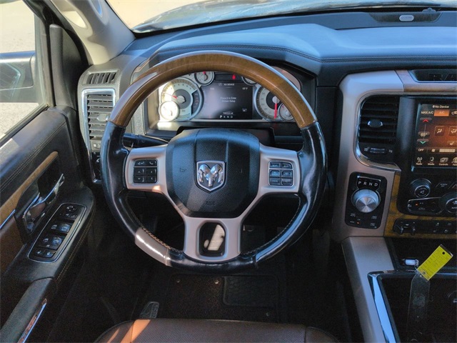 This 2015 Ram 1500 Laramie Longhorn in Western Brown features: 4D Crew Cab, HEMI 5.7L V8 Multi Displacement VVT, 8-Speed Automatic, 4WD, 10 Speakers, 115V Auxiliary Power Outlet, 20" x 9" Aluminum Polished/Gold Inserts Wheels, 4-Wheel Disc Brakes, ABS brakes, Adjustable pedals, Anti-Spin Differential Rear Axle, Audio memory, Auto High Beam Headlamp Control, Auto-dimming door mirrors, Auto-dimming Rear-View mirror, Automatic temperature control, Backup Camera, Brake assist, Chrome Tubular Side Steps, Class IV Receiver Hitch, Cold Weather Package, Compass, Convenience Group, Convenience Package, Delay-off headlights, Electronic Stability Control, Emergency communication system, Engine Block Heater, Front Bucket Seats, Front Center Armrest w/Storage, Front dual zone A/C, Front fog lights, Front wheel independent suspension, Fully automatic headlights, Garage door transmitter, Genuine wood dashboard insert, Genuine wood door panel insert, Heated door mirrors, Heated Front Seats, Heated rear seats, Heated Second Row Seats, Heated Steering Wheel, Heated steering wheel, High Back Seats, Illuminated entry, Keyless Enter-N-Go, Leather Seats, Leather Shift Knob, Leather steering wheel, Low tire pressure warning, Memory Package, Memory seat, Navigation System, Outside temperature display, Overhead console, Panic alarm, ParkView Rear Back-Up Camera, Pedal memory, Power Chrome Trailer Tow Mirrors, Power door mirrors, Power Mirror Package, Power Package, Power passenger seat, Protection Group, Push Button Start, Quick Order Package 26K Laramie Longhorn, Radio data system, Radio: Uconnect 8.4AN AM/FM/SXM/HD/BT/NAV, Rain Sensitive Windshield Wipers, RamBox Cargo Management System, Rear seat center armrest, Rear step bumper, Remote keyless entry, Remote Proximity Keyless Entry, Security system, Skid Plate Package, Speed control, Steering Wheel Mounted Audio Controls, Tilt steering wheel, Tow Package, Traction control, Trailer Brake Control, Trailer Package, Trailer Tow Mirrors, Trailer Tow Mirrors & Brake Group, Trip computer, Turn signal indicator mirrors, Ventilated Front Seats.
