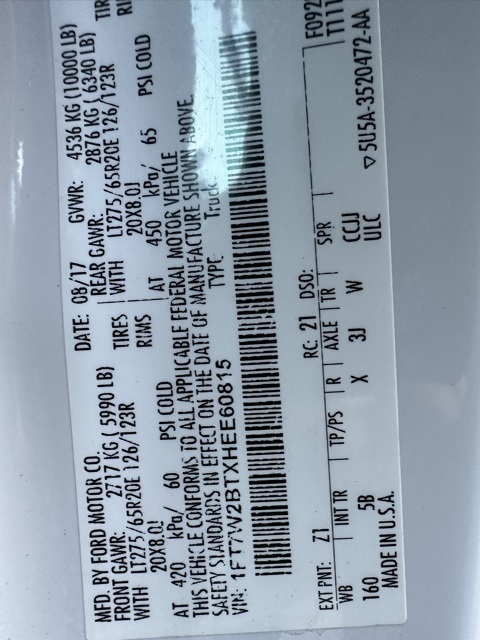- VIN : 1FT7W2BTXHEE60815