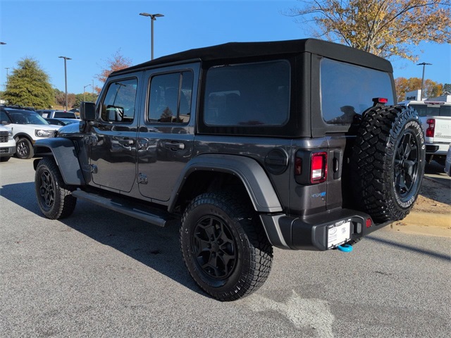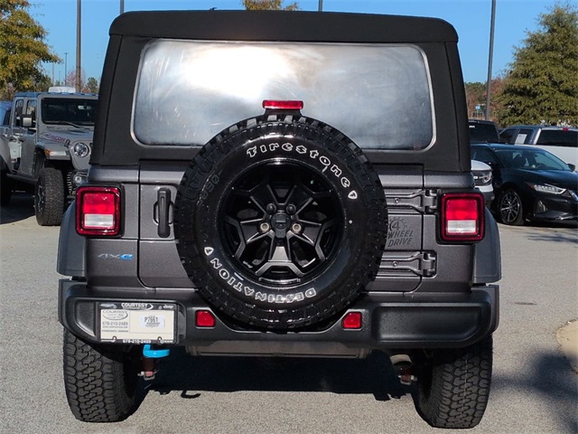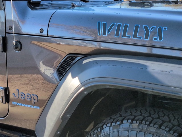 This 2023 Jeep Wrangler Willys 4xe in Granite Crystal Metallic Clearcoat features: 4D Sport Utility, 2.0L I4 DOHC, 4WD, 4-Wheel Disc Brakes, 4G WiFi Hotspot Telematics, 4xe 4-Wheel Drive Swing Gate Decal, 9 Speakers, 97 MPH Vehicle Max Speed Calibration, ABS brakes, Alloy wheels, AM/FM radio: SiriusXM, Android Auto, Anti-Spin Differential Rear Axle, Apple Carplay, Apple CarPlay/Android Auto, Auto LED Headlights, Automatic temperature control, Backup Camera, Black Grille, Bluetooth w/ Audio Streaming, Brake assist, Compass, Delay-off headlights, Electronic Stability Control, Emergency communication system: SiriusXM Guardian, Front Bucket Seats, Front Center Armrest w/Storage, Front dual zone A/C, Front fog lights, Front LED Fog Lamps, Fully automatic headlights, GPS Antenna Input, Heated door mirrors, Hill Start Assist, Illuminated entry, Integrated roll-over protection, Integrated Voice Command w/Bluetooth, LED Foglights, LED Headlamp & Fog Lamp Group, LED Premium Reflector Headlamps, Low tire pressure warning, Molded-In-Color Fender Flares (2-Piece), MOPAR All-Weather Floor Mats, Outside temperature display, Panic alarm, ParkView Rear Back-Up Camera, Passenger door bin, Power door mirrors, Power Mirror Package, Power Package, Power steering, Power windows, Preferred Equipment Package, Premium Audio Package, Premium Sound Package, Quick Order Package 29W Willys, Radio: Uconnect 4C Nav w/8.4" Display, Remote keyless entry, Security system, Split folding rear seat, Steering wheel mounted audio controls, Telescoping steering wheel, Tilt steering wheel, Traction control, Trip computer, Variably intermittent wipers, Wheels: 17" x 7.5" Black Aluminum, Willys, Willys 4xe Hood Decal.